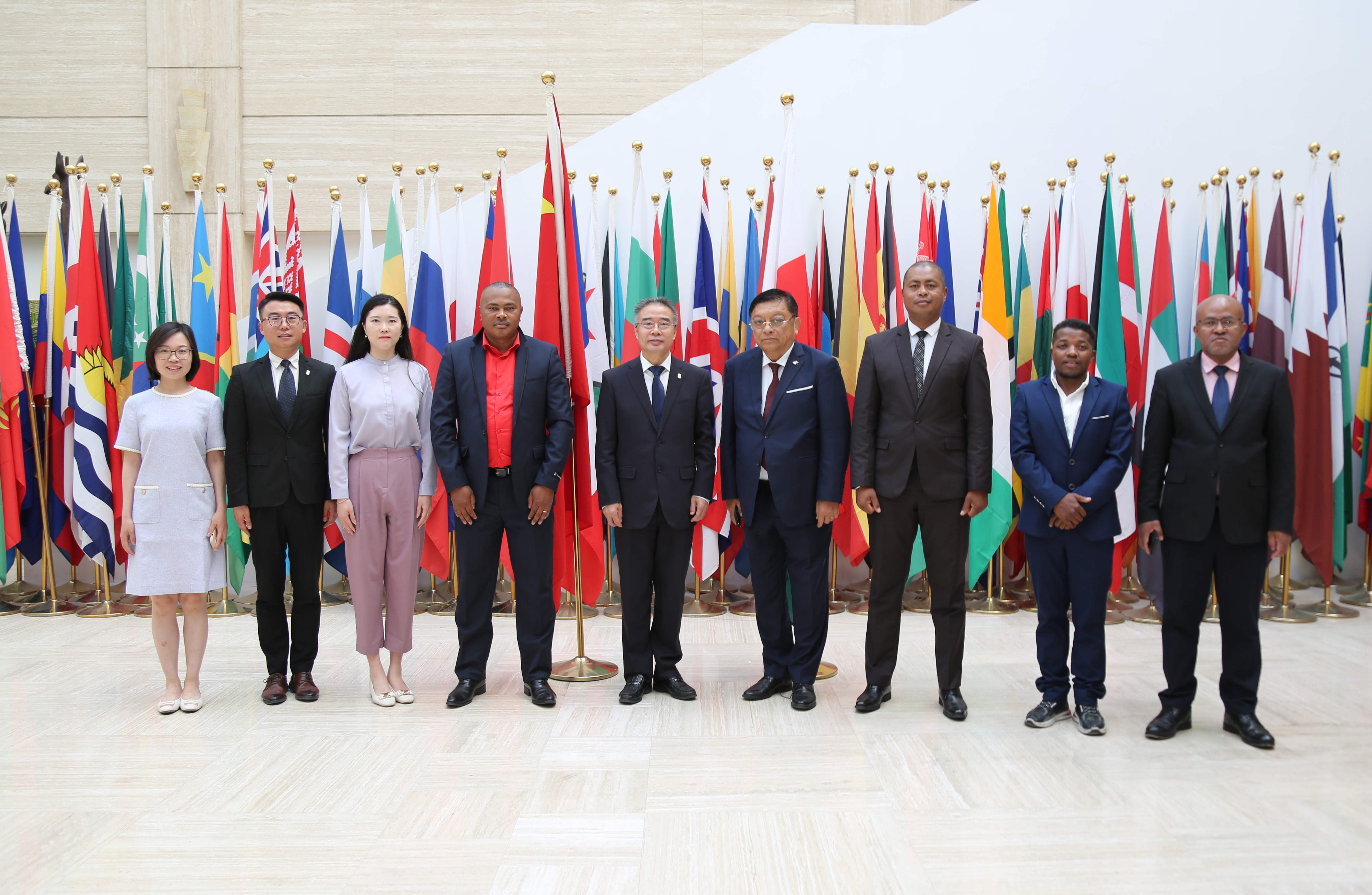 2024年5月13日,马达加斯加驻华大使让·路易斯·罗班松·理查德、菲亚纳兰楚阿大学校长哈贾拉莱纳·艾梅·理查德一行到访基金会。赵灵山副理事长、秘书长会见代表团一行,双方就菲亚纳兰楚阿大学新建孔子学院工作进行了友好交流。